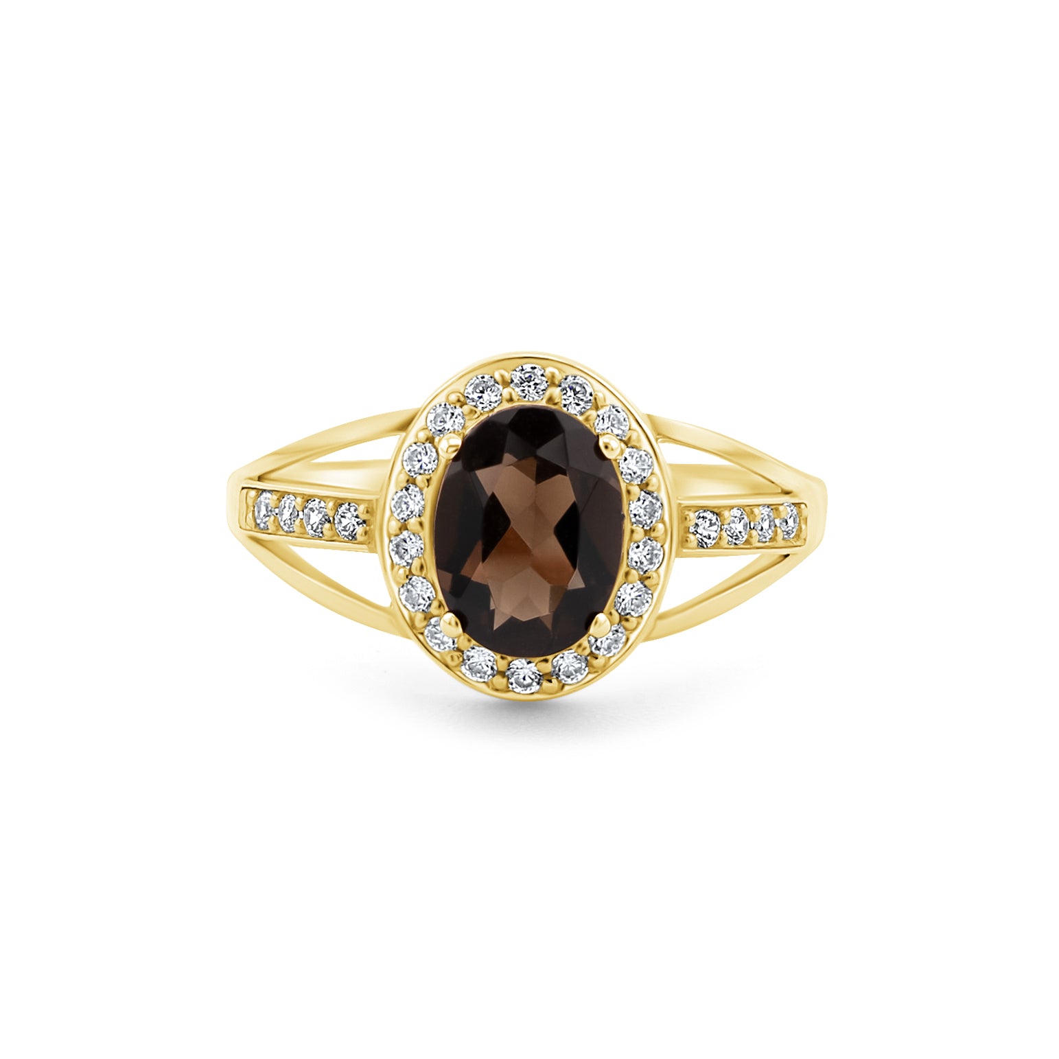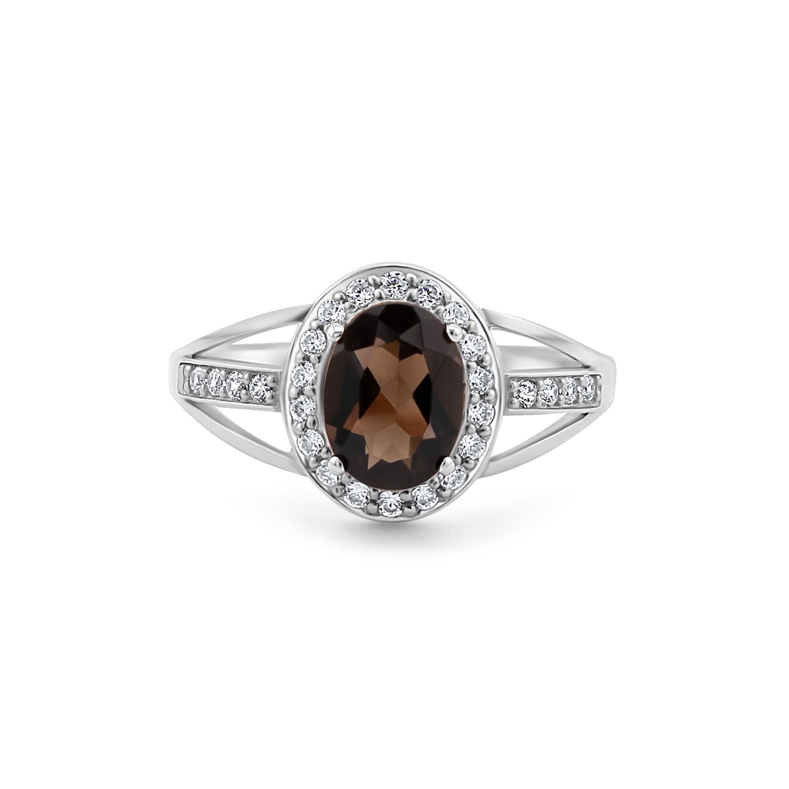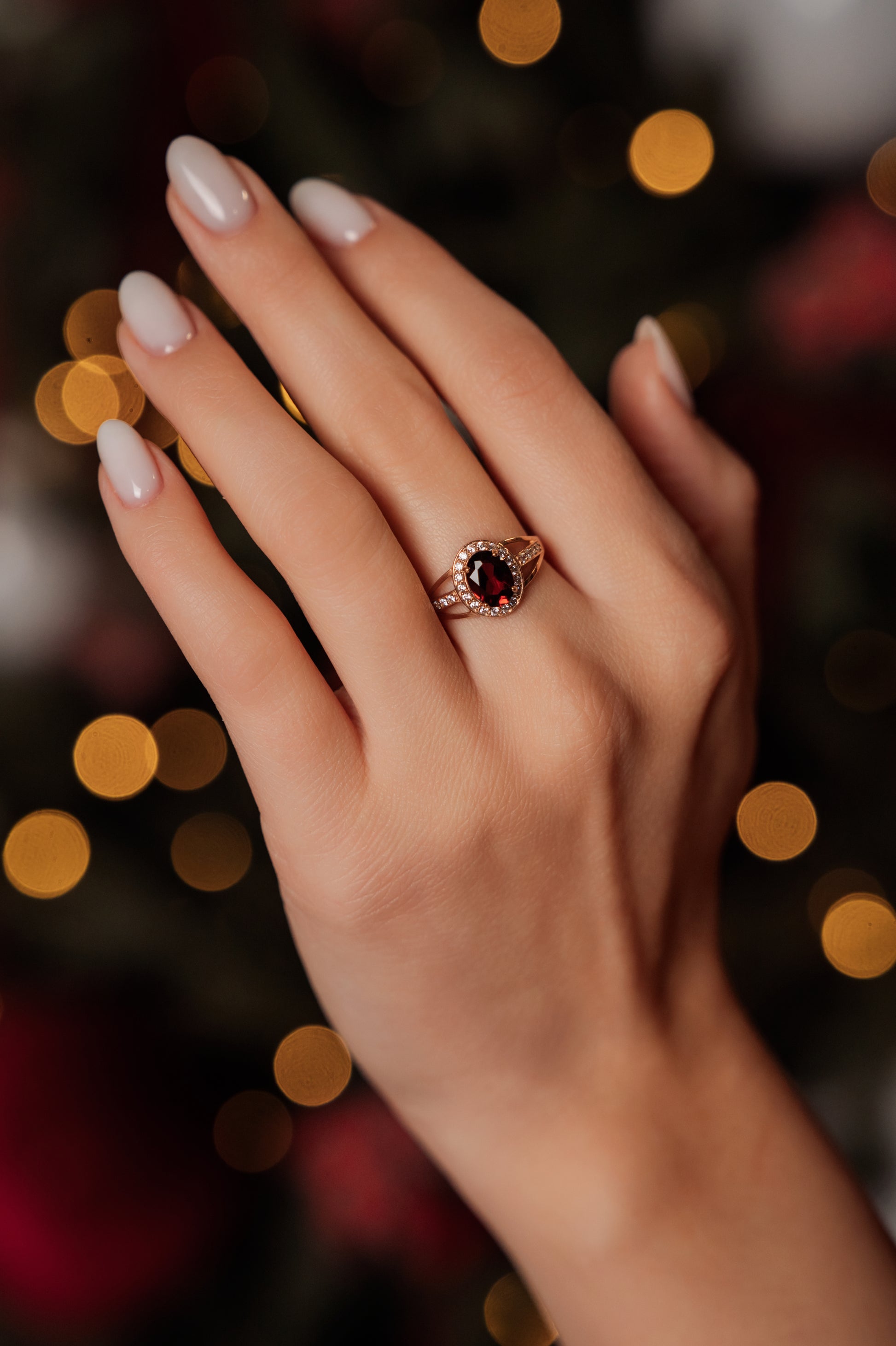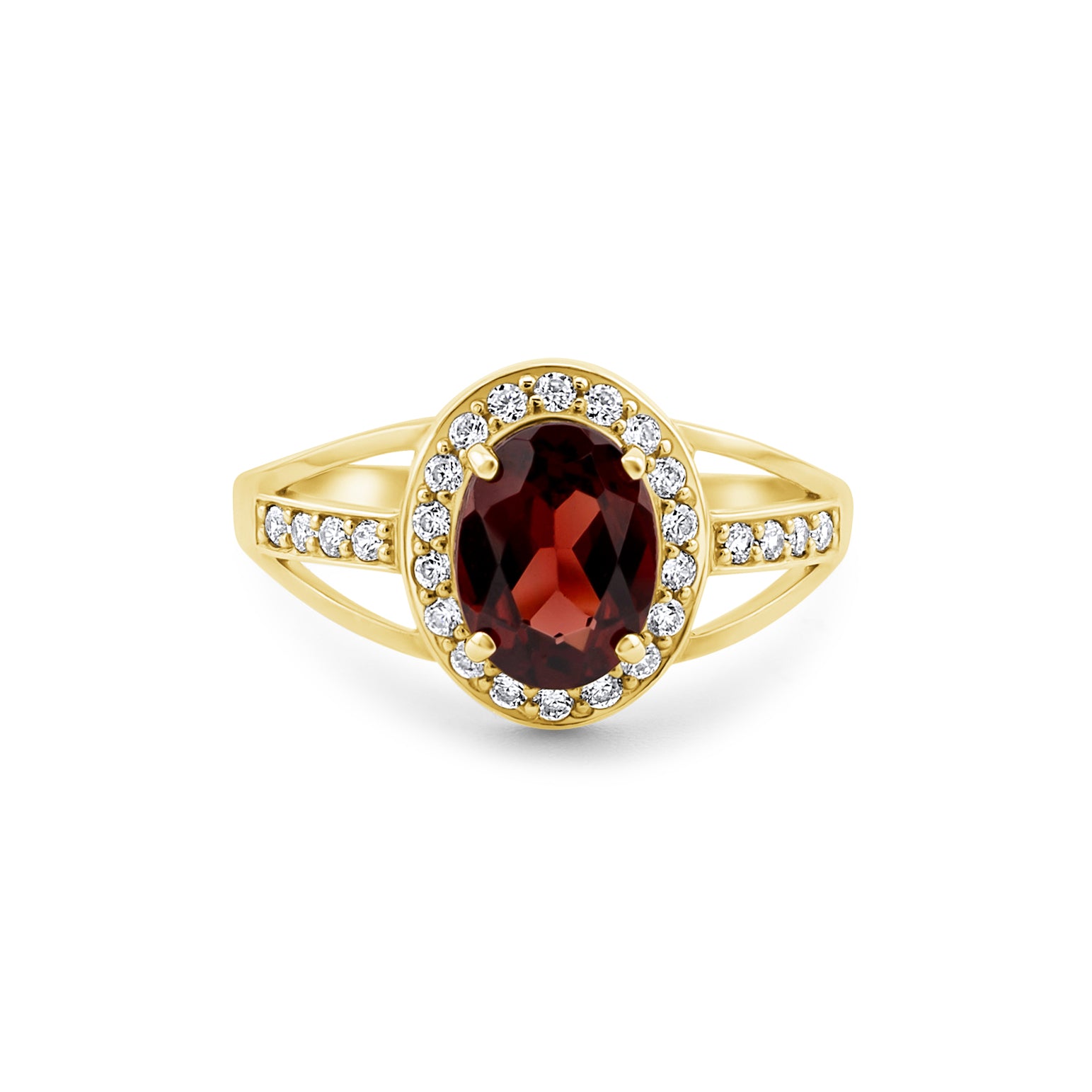 - Akmuo: Raudonasis granatas/Rudasis dūminis kvarcas; šalia akmens iš šonų balti cirkoniai;