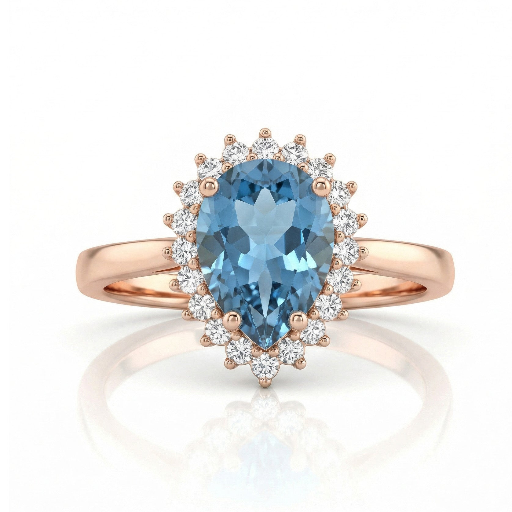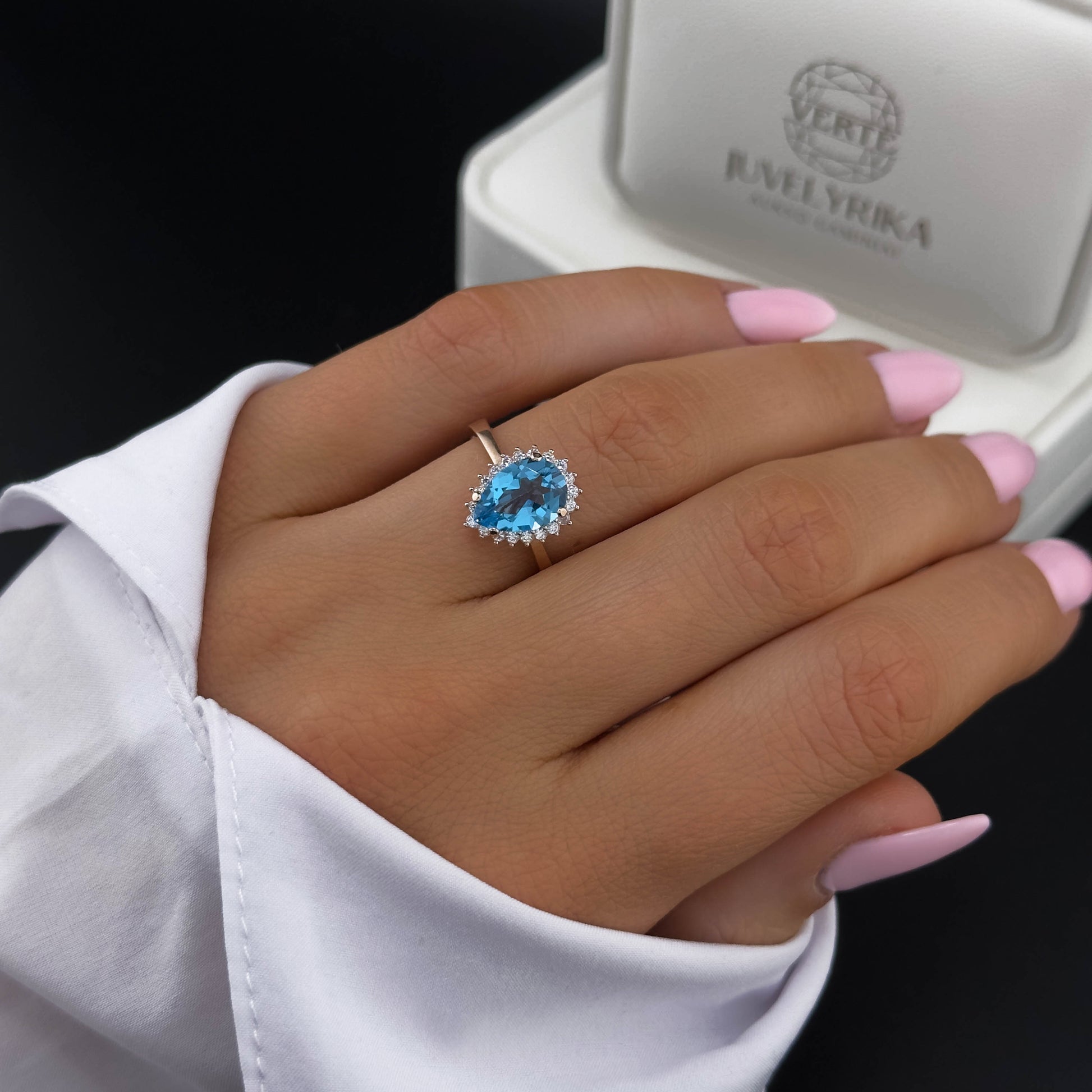 - Akmenys: Mėlynasis topazas, aplink akmenį balti cirkoniai.