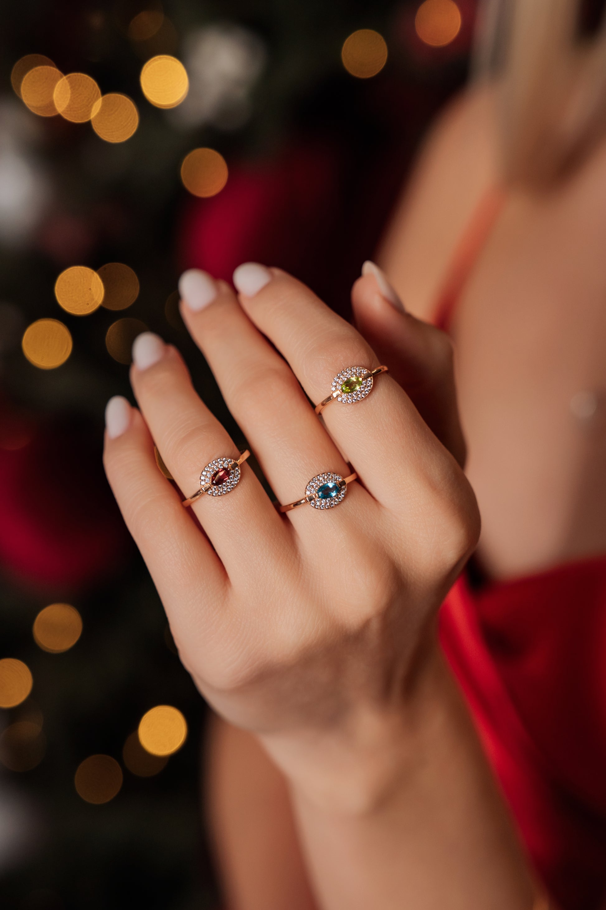 - Akmuo: Raudonasis granatas/Mėlynasis topazas/Žaliasis peroditas; šalia akmens iš šonų balti cirkoniai;